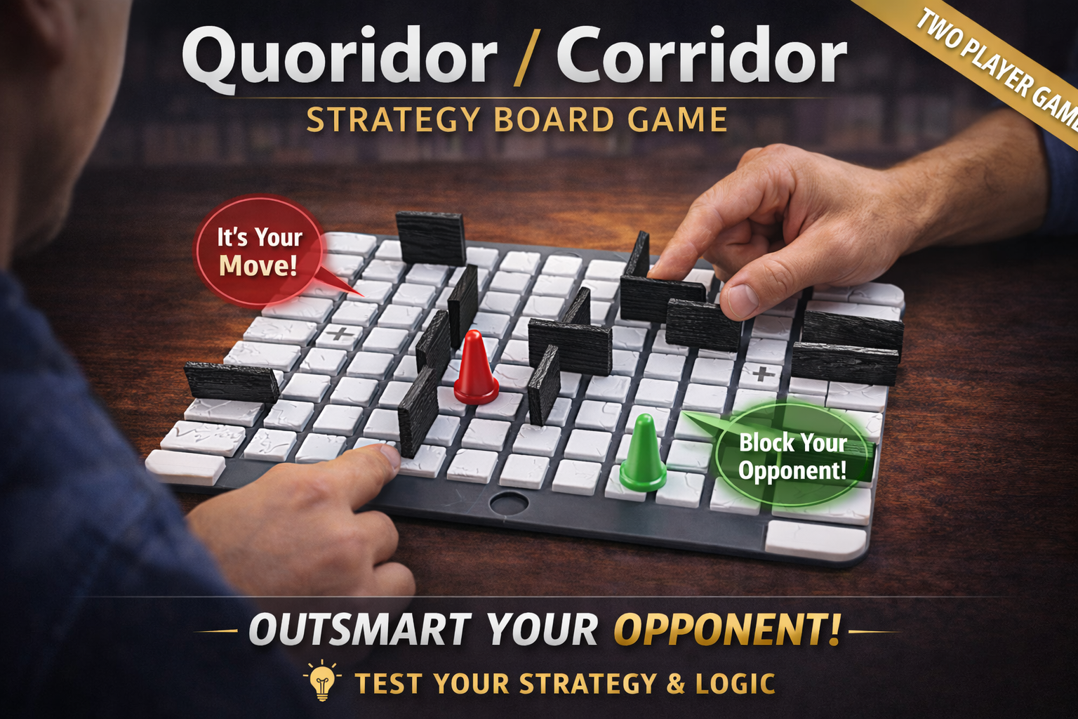 The goal is simple: move your pawn across the board before your opponent does. However, the challenge lies in the clever placement of walls to block your opponent’s path—without completely trapping them. Every decision counts, making Quoridor a perfect blend of strategy, patience, and tactical thinking.